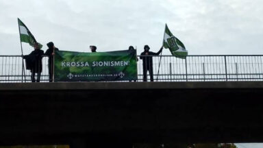Krossa sionismen – Banderollaktion i Stockholm Den 7 oktober, med anledning av årsdagen när den palestinska motståndsrörelsen Hamas slog tillbaka mot terrorstaten Israel, valde Näste 1 att genomföra en broaktion med parollen Krossa sionismen!