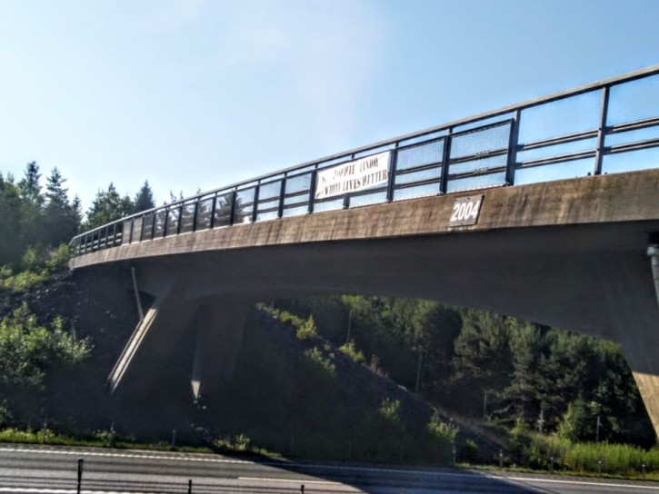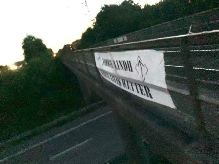Det sattes bland annat upp banderoller på en järnvägsbro över E6 i Helsingborg.