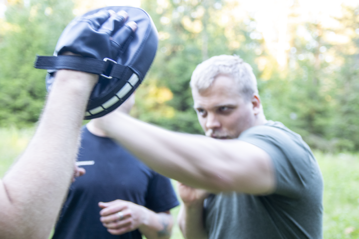 Efter att maten hunnit smälta något bestämde man sig för att ta en skogspromenad till något lämpligt område där de praktiska delarna av föredraget skulle kunna genomföras. Man hittade platsen efter en gammal gård där det var plant och Martin började den praktiska delen med några enkla övningar i fallteknik för att sedan avancera till lite grepp och avvärjande övningar.