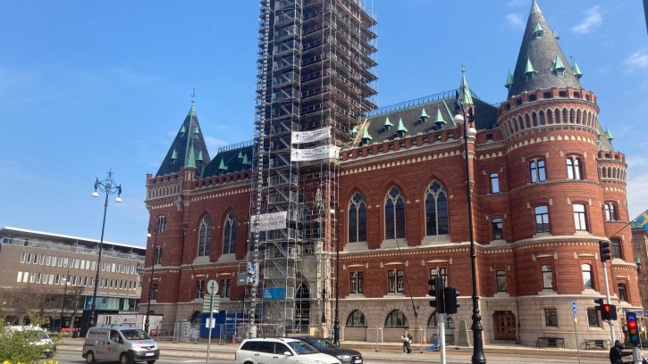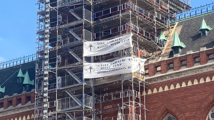 Aktivister i Skåne har satt upp banderoller på rådhuset mitt i Helsingborg.