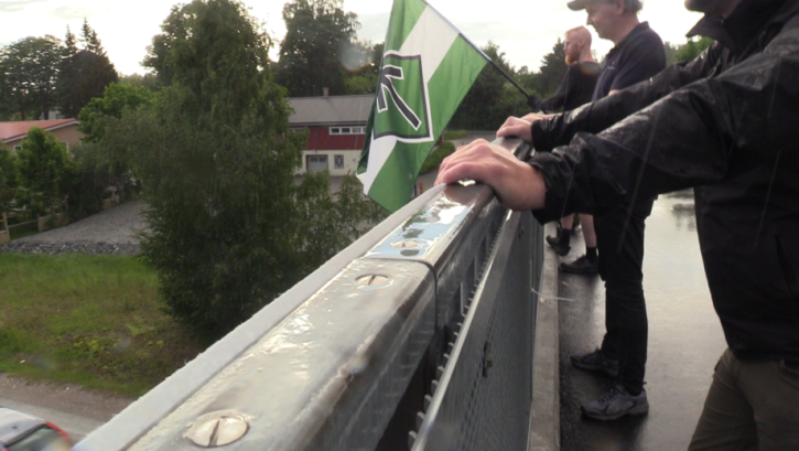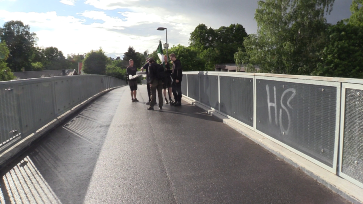 Med hjälp av fanor och en nytillverkad banderoll med budskapet ”Systemet daltar med pedofiler – det gör inte vi!”, ställde motståndsmännen upp på gångbron.