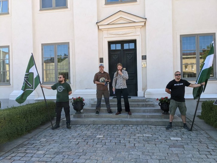 15:15. Nordiska motståndsrörelsen har nu ställt upp utanför landshövdingens residens i Härnösand. David Nilsson är åter igång med att hålla tal.