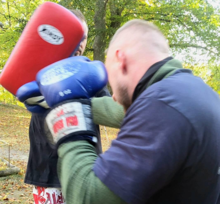 Efter detta tränades försvar mot knivbeväpnad antagonist, varpå man övergick till att träna olika slag och sparkserier. Träningspasset avslutades med sparring.