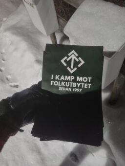 När gruppen stigit av, förflyttat sig genom Gamla stan, och mötts av mångas blickar, blev första anhalt Sveriges riksdag. Där ställdes det sedvanligt upp med banderoll och Tyrrunefana, samtidigt som andra började dela ut flygblad till förbipasserande.