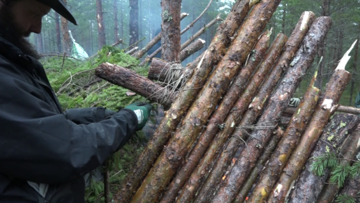 En av deltagarna väljer att bygga en egen lite koja, medans de andra samarbetar i att bygga en rätt omfattande bivack med tillhörande reflektorvägg, och gott om granris som underlag.