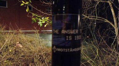 Banderolluppsättning i södra Stockholm Vid lunchtid den 14 december sattes banderoller upp av medlemmar från Motståndsrörelsen.