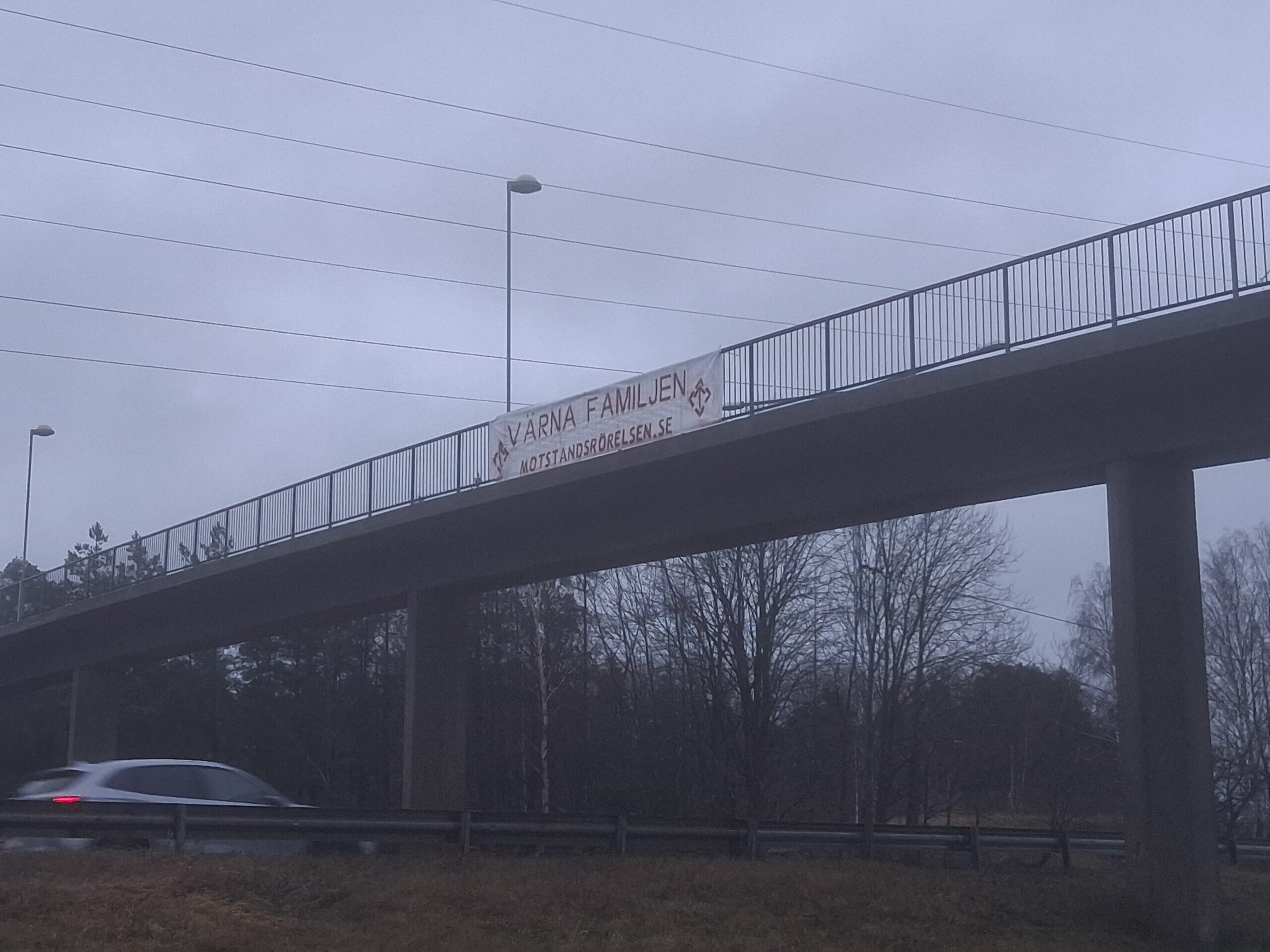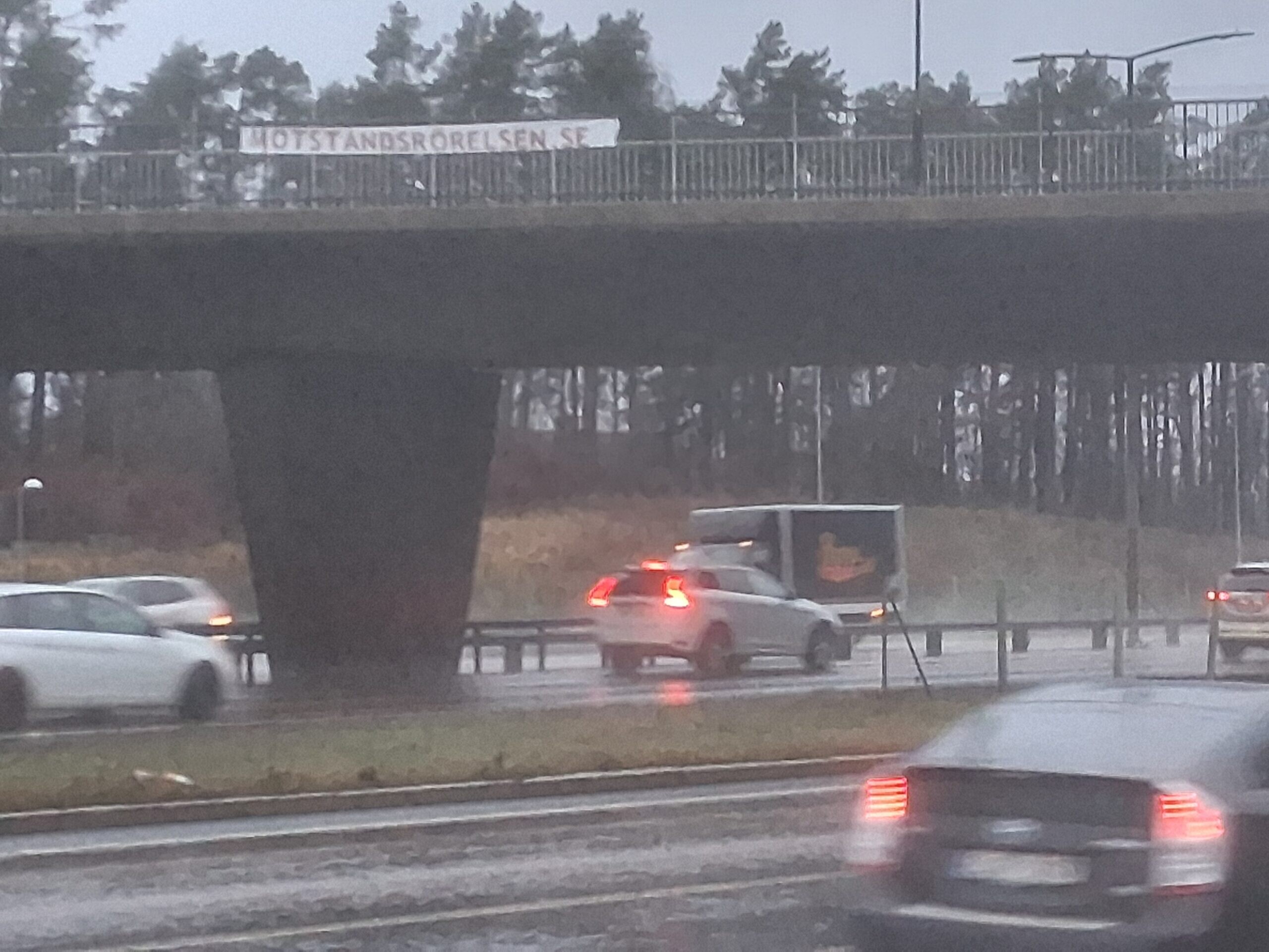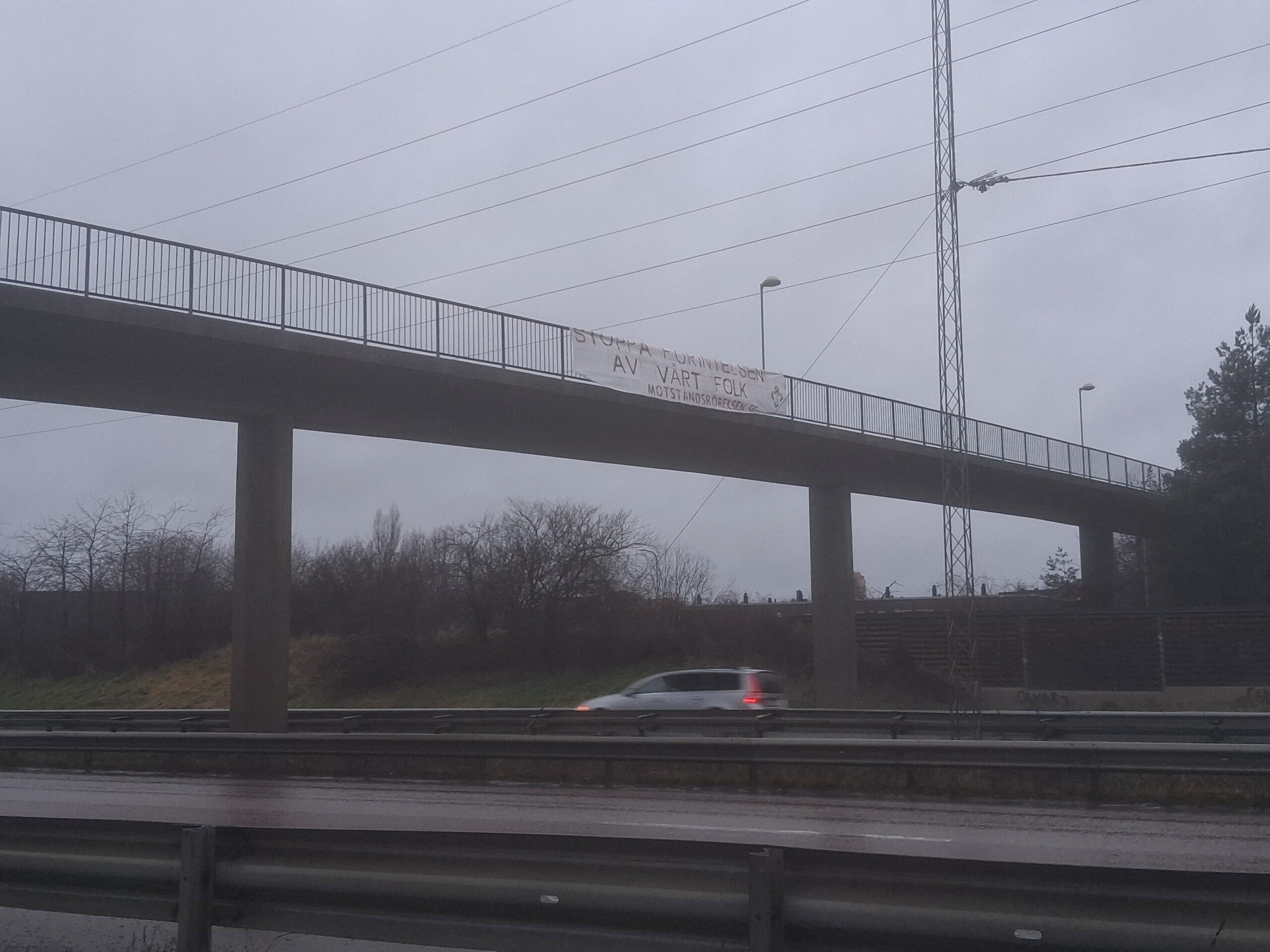 Banderolluppsättning i södra Stockholm Vid lunchtid den 14 december sattes banderoller upp av medlemmar från Motståndsrörelsen.