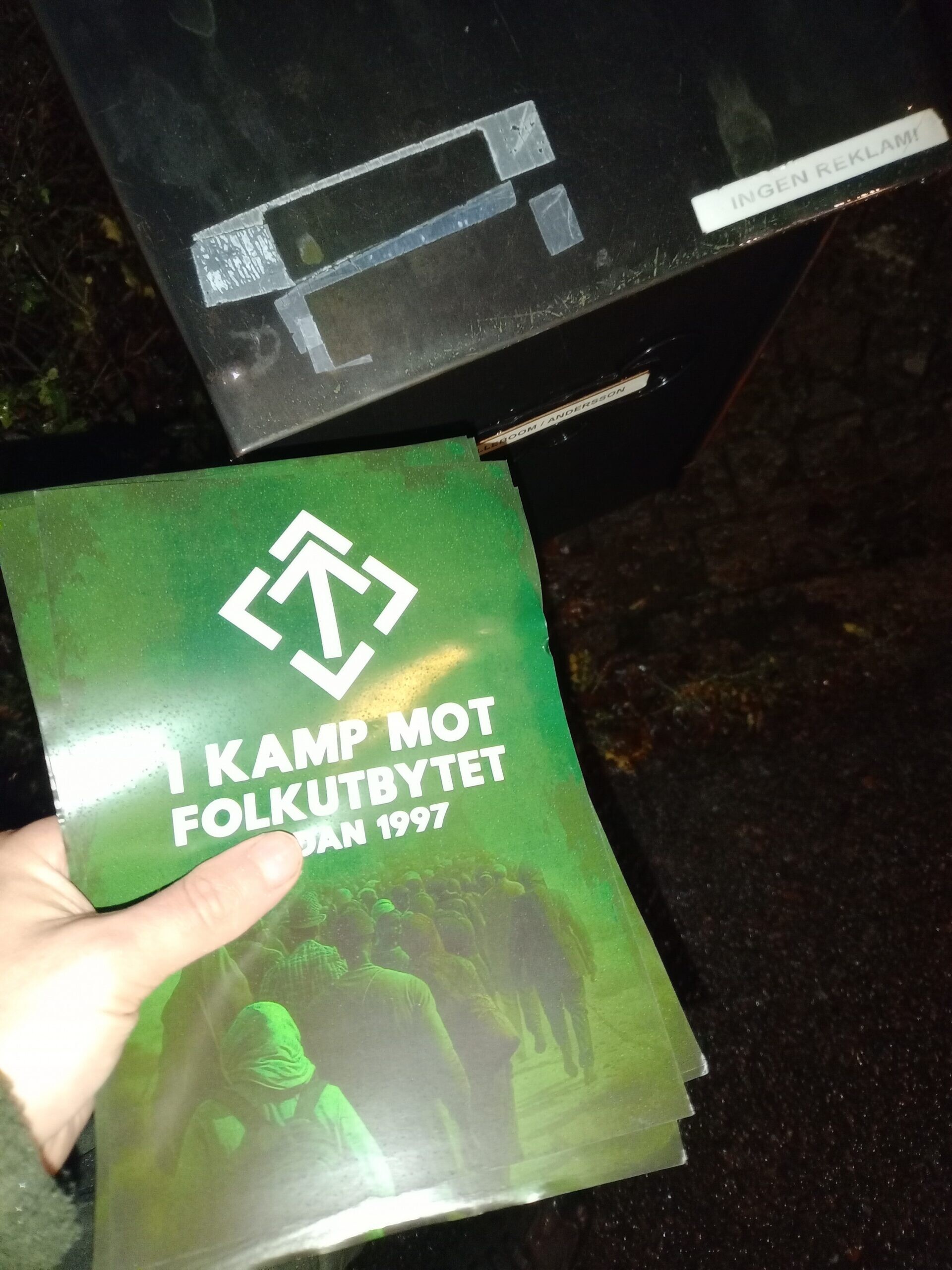 Flygblad spreds i Karlstad Några kamrater träffades på fredagen den 12 december för att dela ut flygblad från Motståndsrörelsen till hem i Karlstad. Aktiviteten var uppskattad av samtliga deltagare.