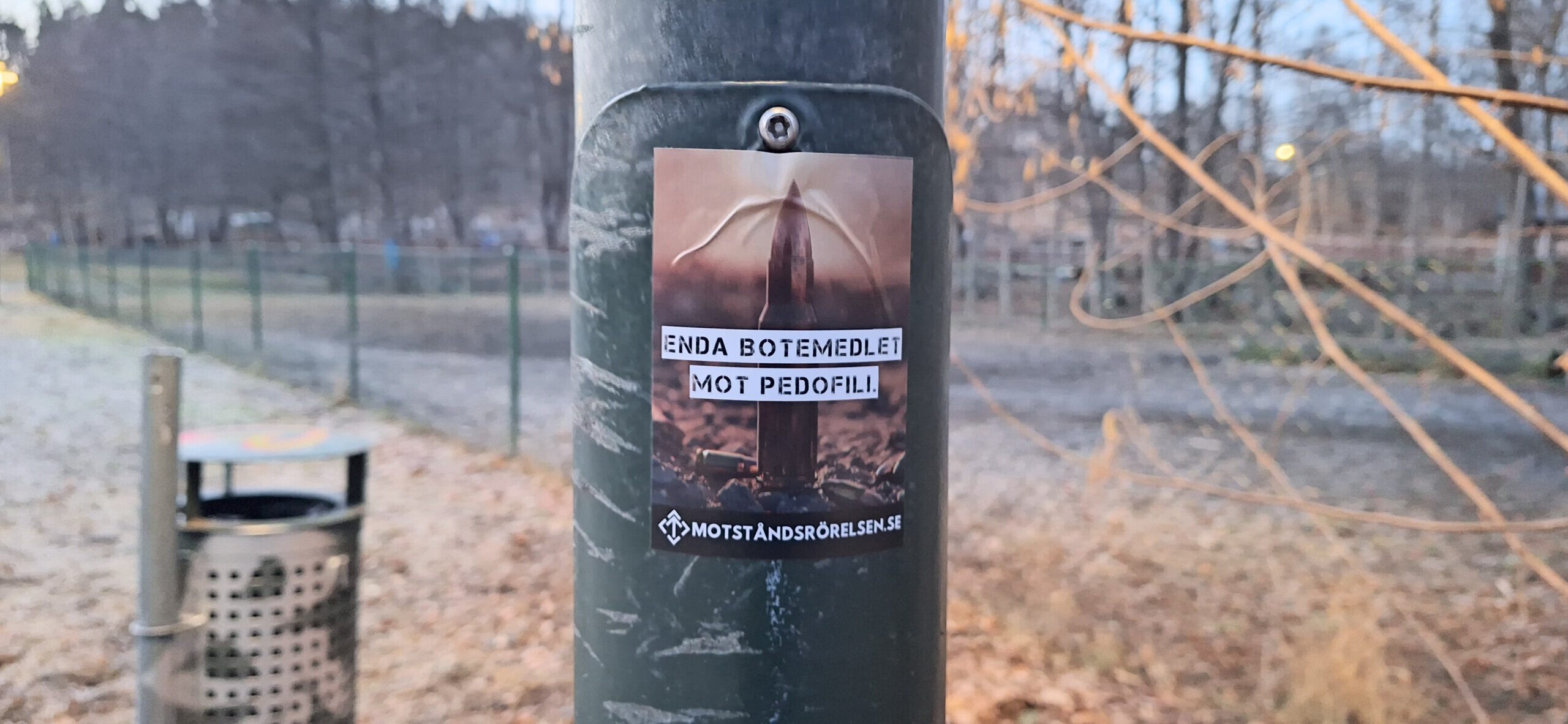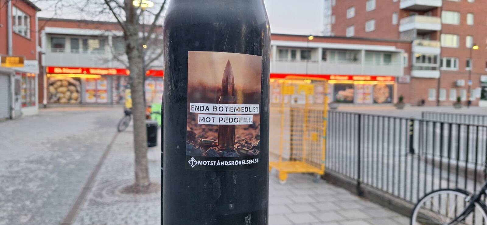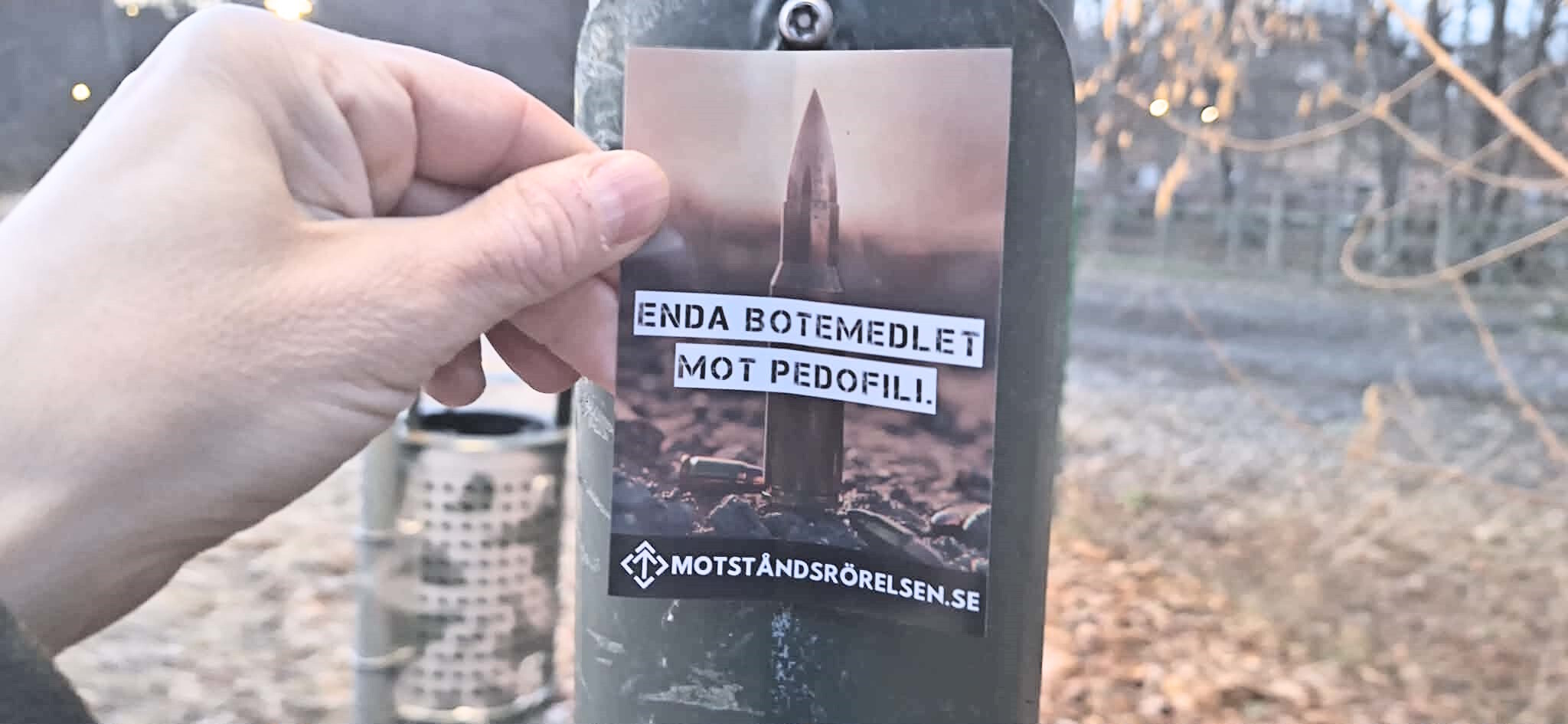 Under måndagen den 23 mars sattes klistermärken upp i Stockholm. Klistermärkena bar texten ”Enda botemedlet mot pedofili – Motståndsrörelsen.se”.