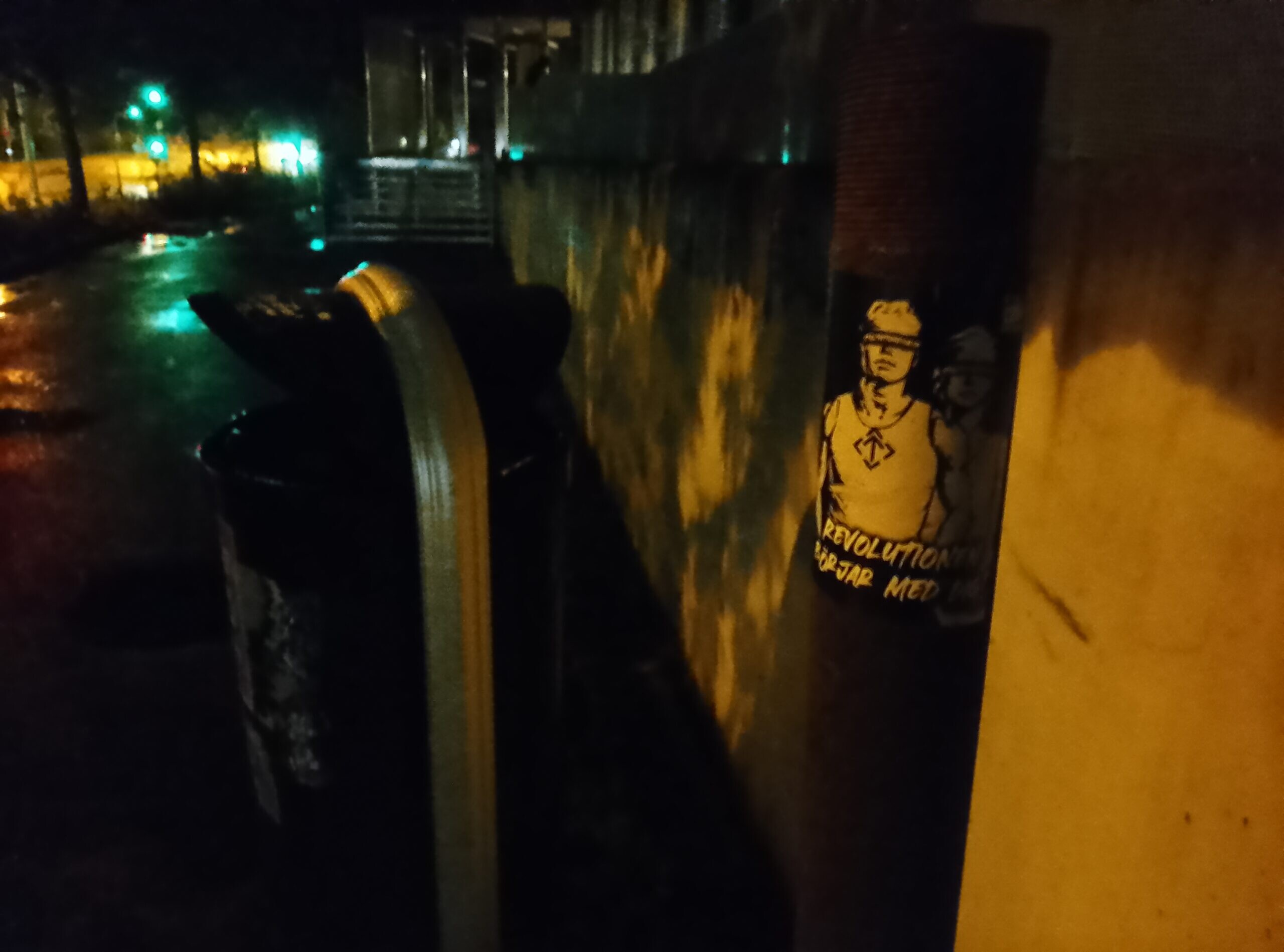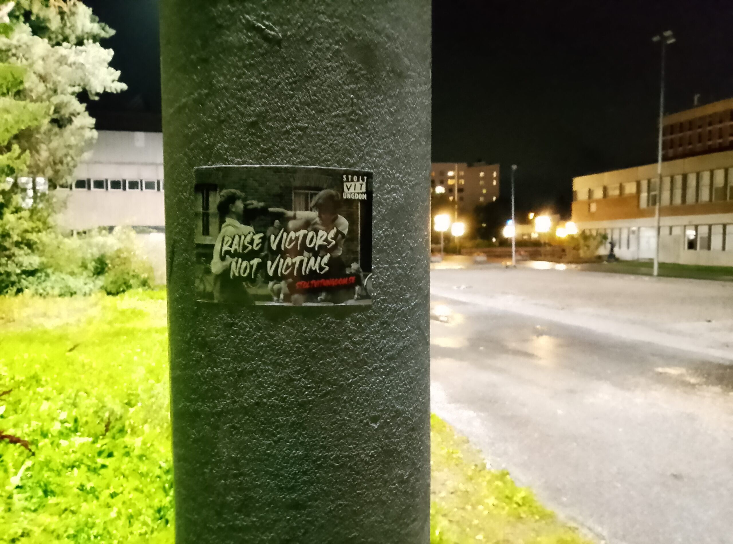 Klistermärken Norrtälje Den 1 oktober satte kamrater upp en större mängd klistermärken vid och runt Rodengymnasiet i Norrtälje.