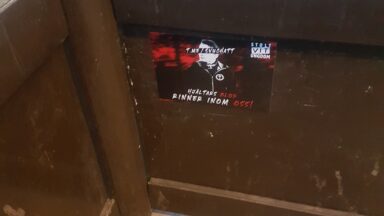 Klistermärkesuppsättning i Göteborg Kvällen 30 december sattes klistermärken upp vid Bananpiren eftersom mycket folk samlas där på Nyårsafton.